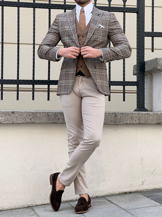 Rockford Beige Slim Fit Peak Lapel Plaid Check Wool Blazer