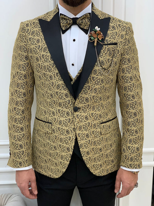 Caesar Golden Slim Fit Peak Lapel Floral Patterned Tuxedo