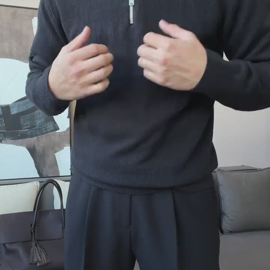 This men's slim fit zip neck knit sweater combines modern styling with exceptional comfort. Featuring a sleek zip neck design and tailored silhouette for a refined look.