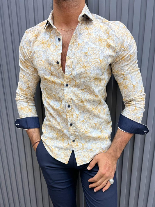 Brabion Lyon Beige Slim Fit Long Sleeve Floral Cotton Shirt