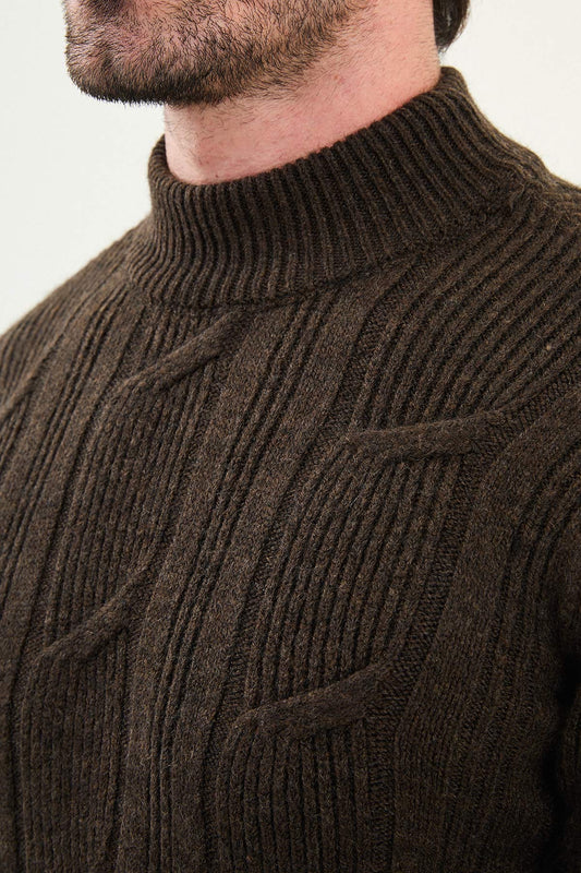 Men’s Brown Knit Half-Turtleneck Pullover – Slim Fit