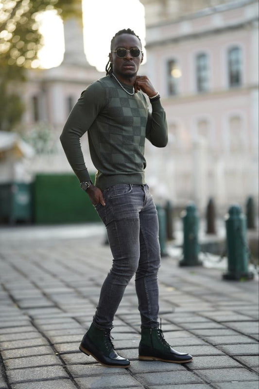 Amber Green Slim Fit Patterned Crewneck Sweater