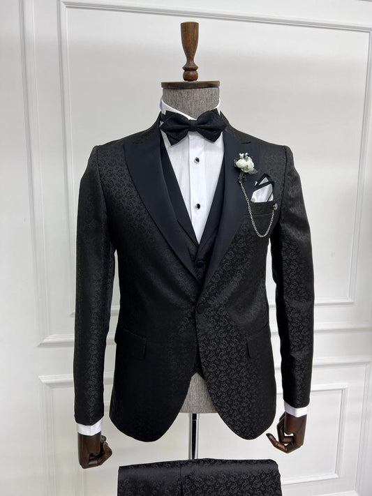 Sorento Black Slim Fit Floral Peak Lapel Tuxedo - Premium Formalwear for Men