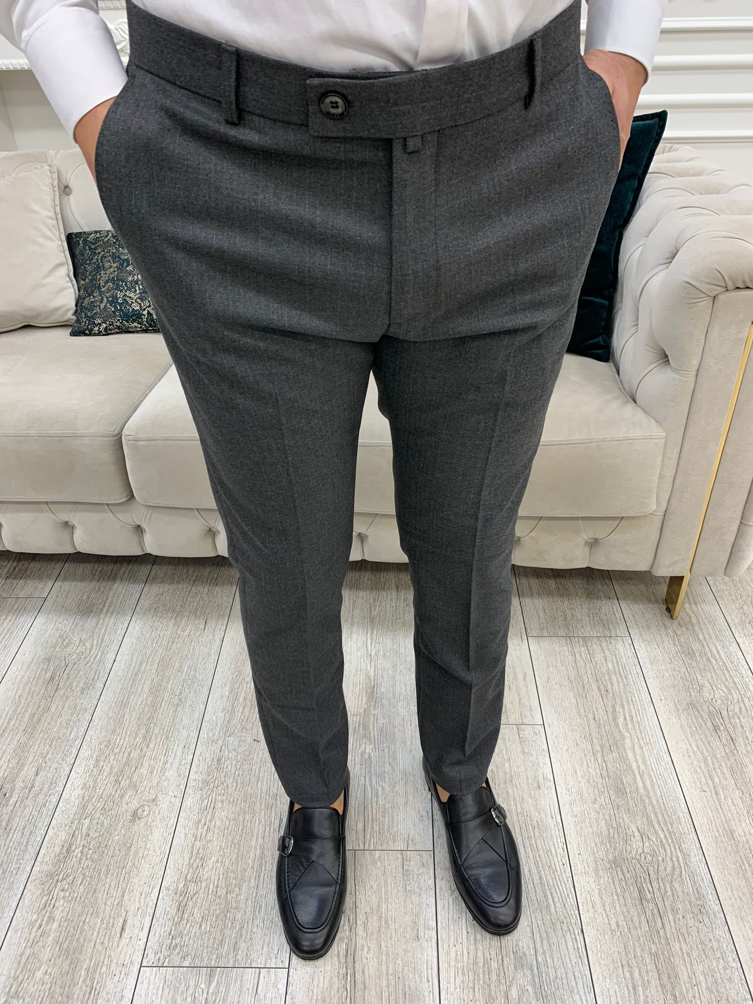 The Anthracite Italian Style Slim Fit Trousers are the perfect blend of elegance and comfort, designed for the modern man. Crafted from a premium blend of 68% Viscose, 30% Polyester, and 2% Lycra, these trousers ensure a flattering fit that pairs effortlessly with both formal and casual attire. Ideal for business meetings, weddings, or smart-casual outings, they elevate any outfit with their sleek silhouette.