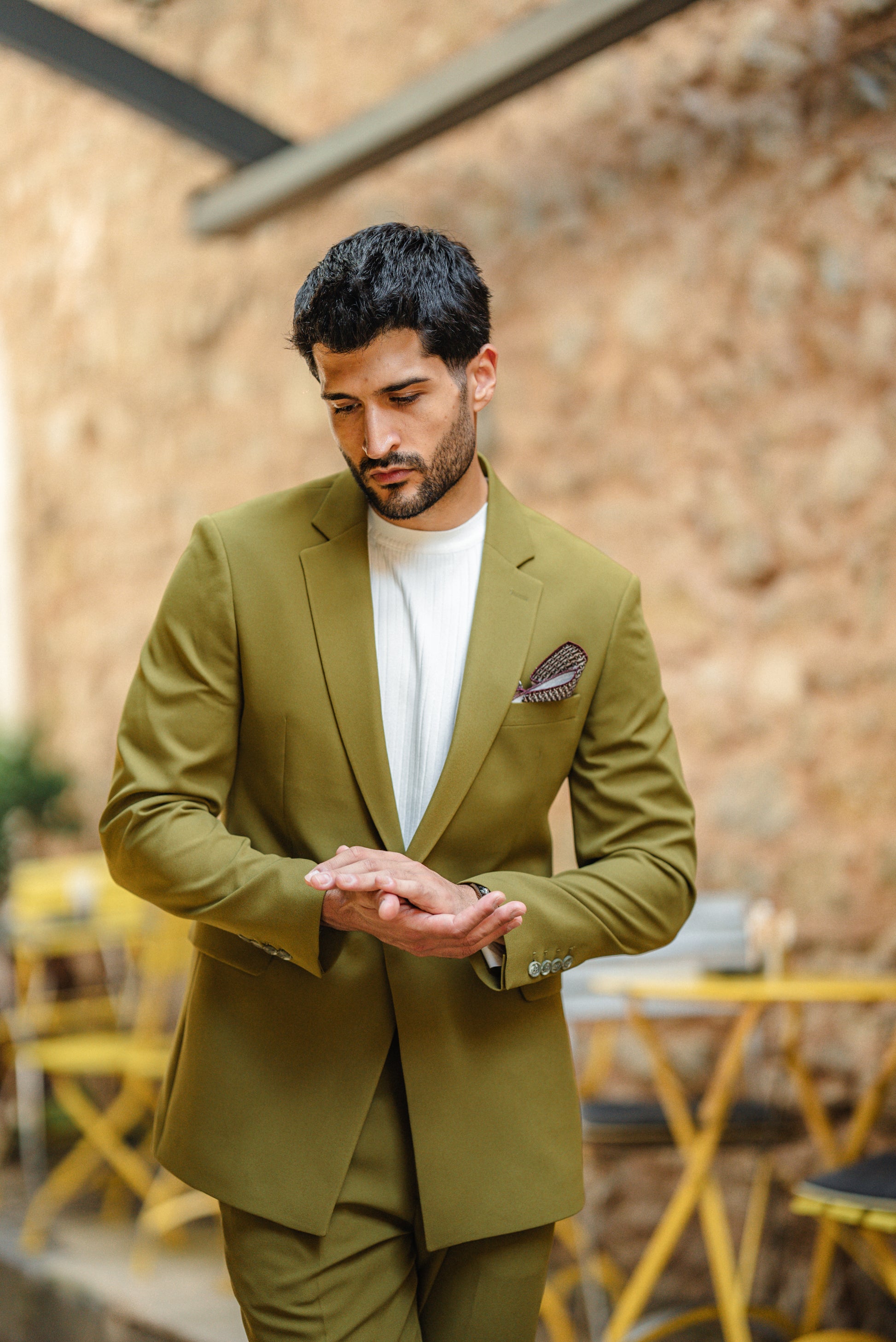 Make a bold statement with the Bora Olive Green Luxury Chain Detailed Suit. This distinctive suit features unique chain detailing and a rich olive green color for those who dare to stand out.
