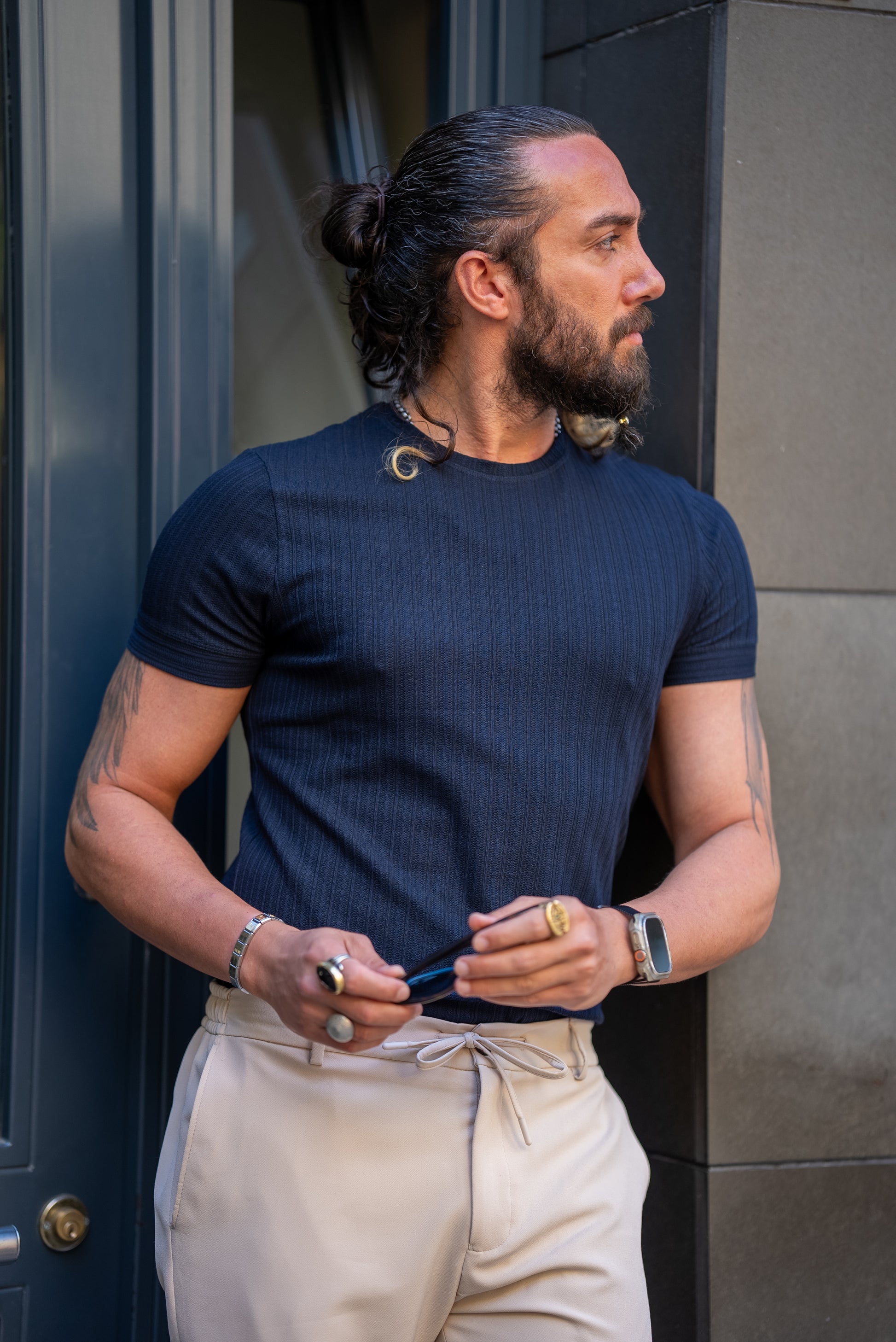 The Brabion Alonso Navy Blue Slim Fit Crew Neck Striped T-Shirt is a blend of style and comfort, ideal for every man's wardrobe. Made from 55% cotton and 45% polyester, this slim-fit t-shirt flatters the figure and enhances any casual or smart-casual look. Perfect for layering or standalone wear, whether you're heading out for the weekend or enjoying a relaxed day at home.