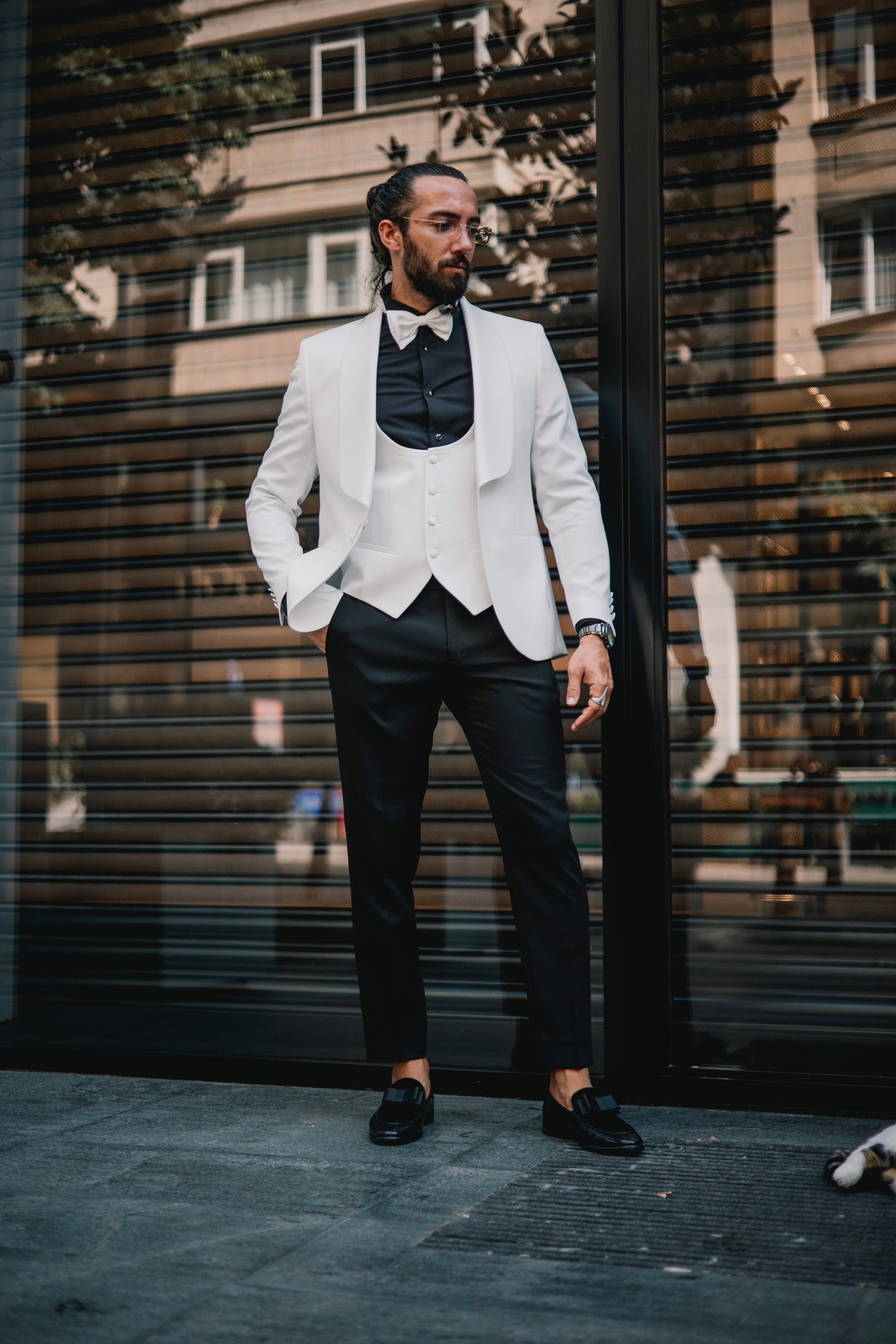Introducing the Brabion Amadeo White Slim Fit Shawl Lapel Tuxedo, a quintessential choice for men seeking timeless elegance. Crafted from a high-quality blend of 45% polyester and 55% cotton, this tuxedo exudes sophistication with its sleek slim fit and double slits for a tailored silhouette. Perfect for weddings, galas, and black-tie events, this set includes a jacket, pants, a shirt, and a bow tie, ensuring you are impeccably dressed for any occasion. Make your formal occasions unforgettable with this modern tuxedo design.