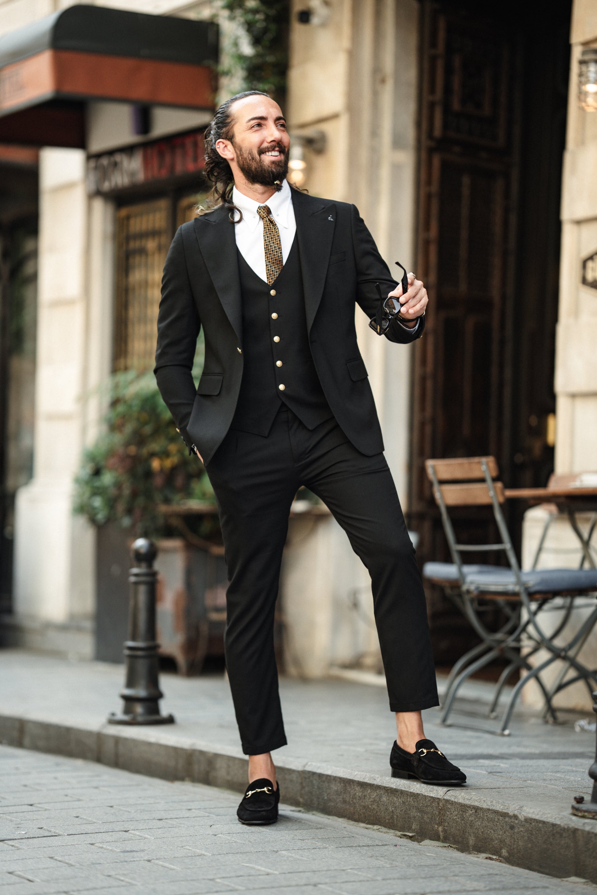The Brabion Noah Jet Black Slim Fit Peak Lapel 3 Piece Suit redefines elegance for modern men. Crafted from high-quality materials, this suit is perfect for a business meeting, wedding, or any formal event. Its sleek design and slim fit ensure a flattering silhouette, allowing you to make a lasting impression. Comfortable and stylish, this suit enhances your confidence, ensuring you look your best.