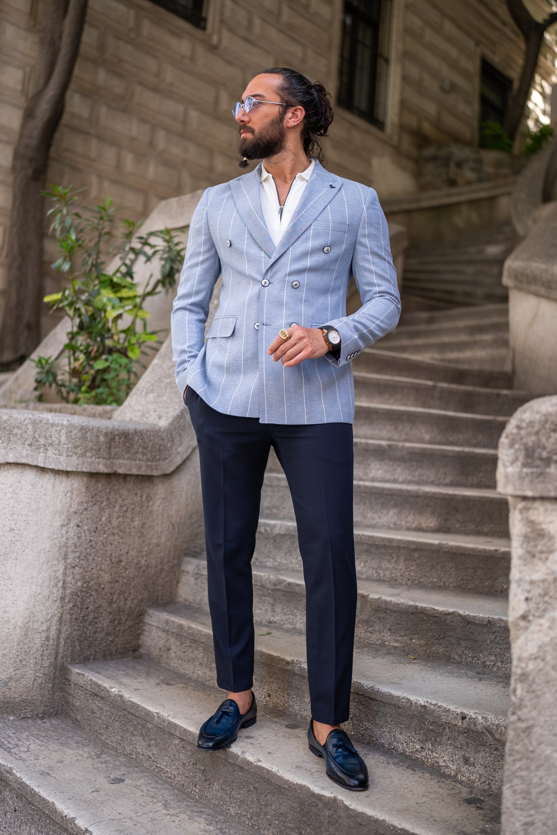 Brabion Noah Sky Blue Slim Fit Double Breasted Striped Blazer