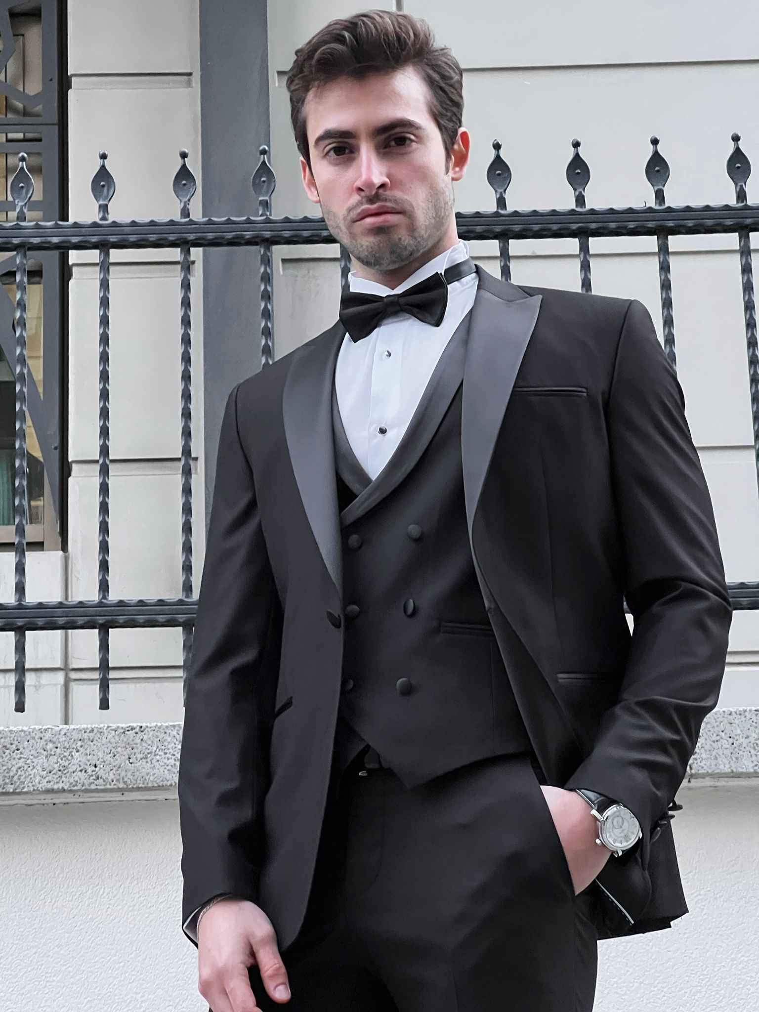 Introducing the Fabio Black Peak Lapel Slim Fit Tuxedo, the epitome of timeless elegance and sophistication. Crafted from a premium blend of 88% wool, 9% polyester, and 3% Lycra, this tuxedo ensures a flattering slim-fit silhouette ideal for weddings, galas, and black-tie events. Its double slits and two-button design offer a sleek and modern look, making it a standout choice for any formalwear occasion. Experience the luxury of a complete package that includes a jacket, pants, shirt, and bowtie, tailored for the discerning gentleman.