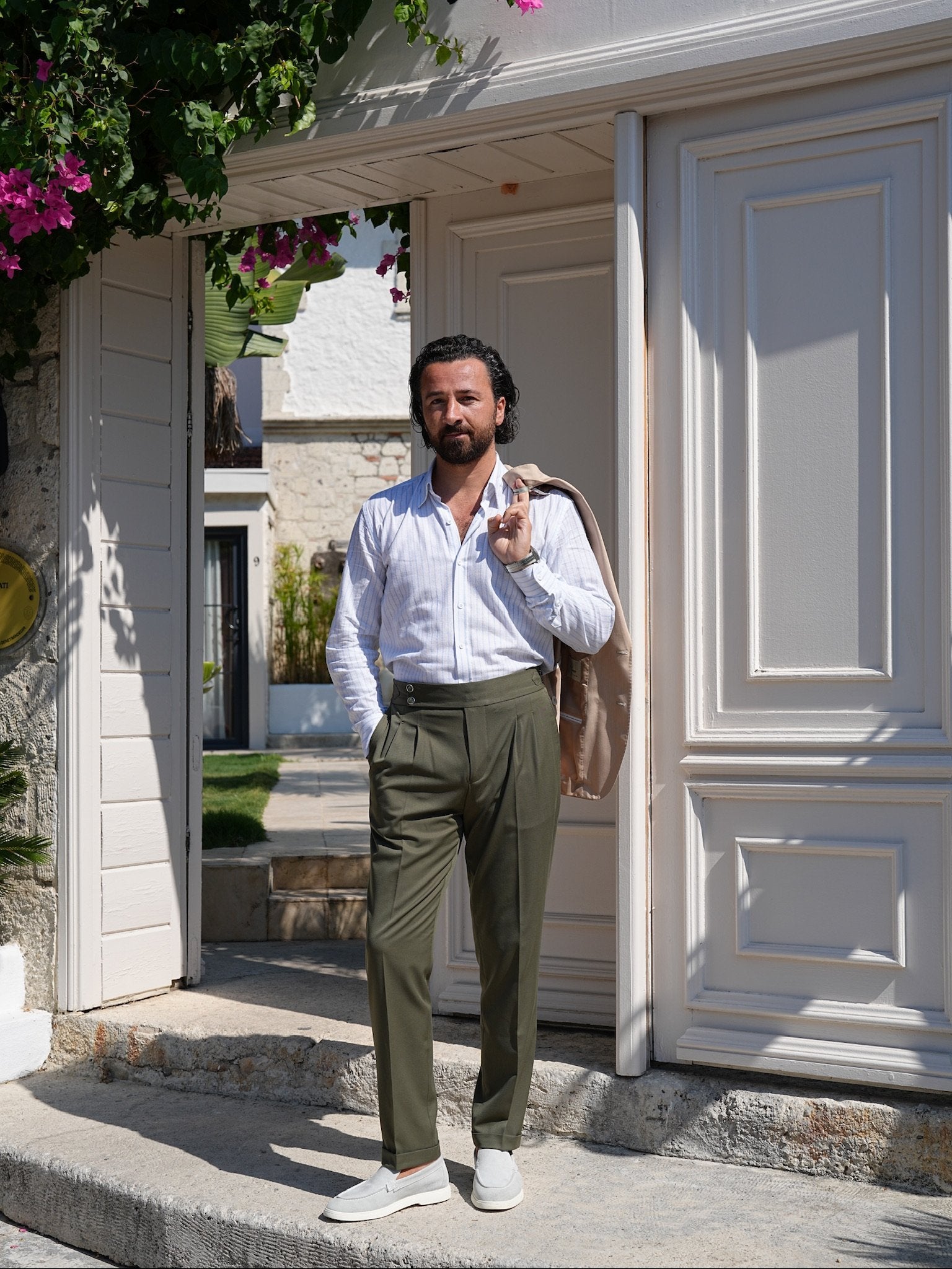 Khaki Green High Waist Pleated Buckle Pants - Regular Fit
