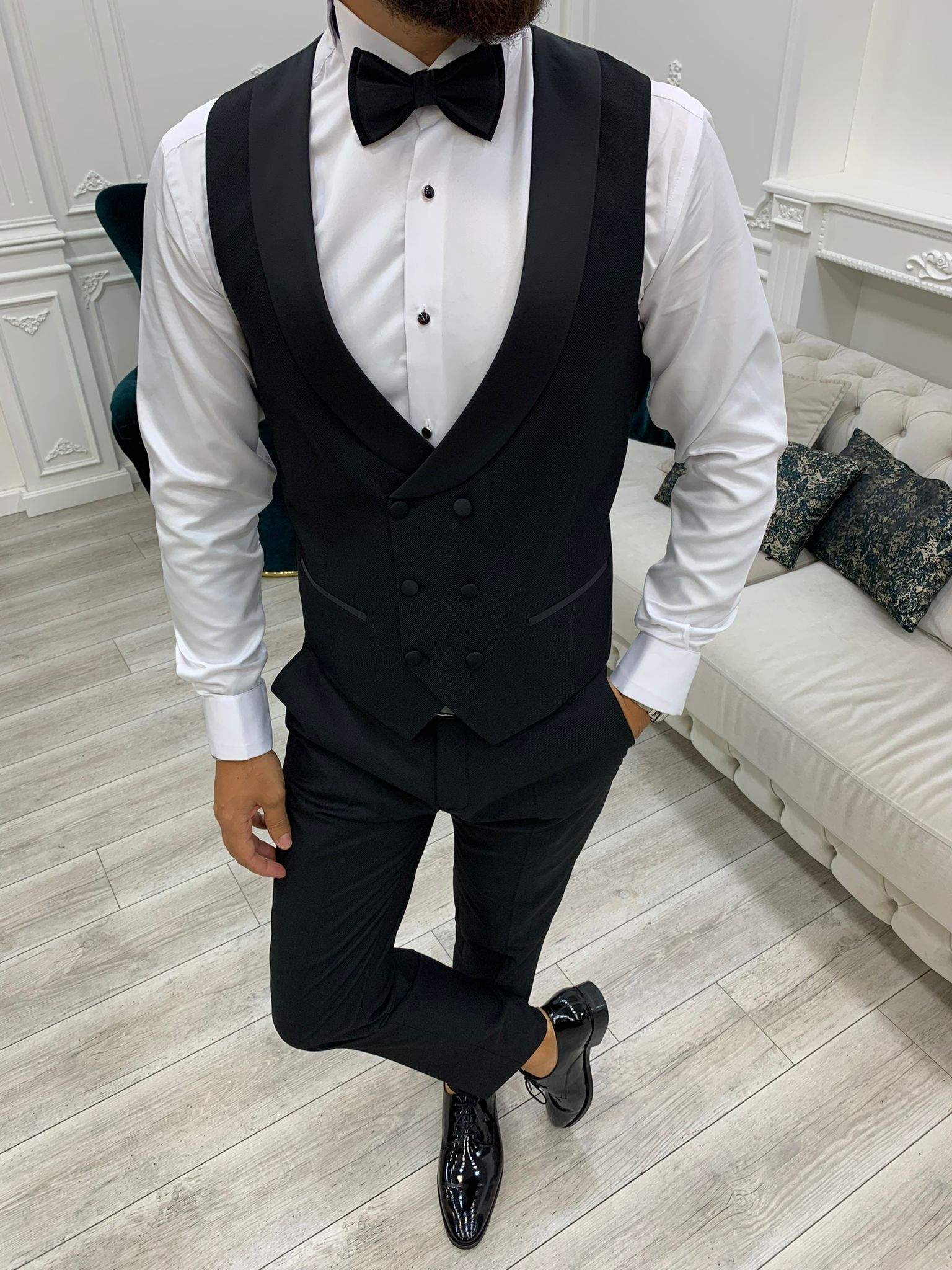 The Lazio Black Slim Fit Shawl Lapel Tuxedo combines modern design with timeless elegance, making it the perfect choice for any formal occasion. Designed with a sophisticated slim-fit cut and crafted from a premium blend of materials, this tuxedo offers exceptional comfort and style. Ideal for weddings, galas, and black-tie events, it features a single-button closure and double slits for a refined silhouette. Complete your look with the included bow tie, flower, and chain for an effortlessly polished appearance.