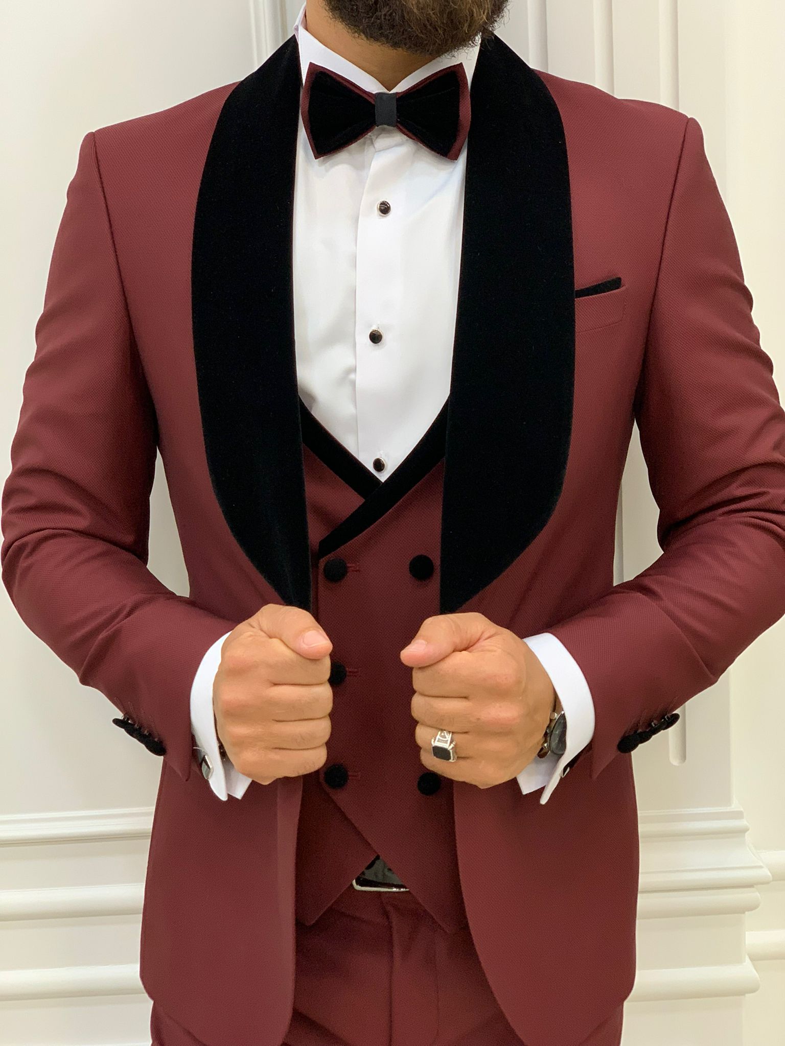 The Lazio Burgundy Slim Fit Velvet Shawl Lapel Tuxedo redefines elegance for any formal occasion. Crafted from a high-quality blend of 65% polyester, 32% viscose, and 3% lycra, this tuxedo offers a refined silhouette with its slim-fit design. The single-button closure and double slits enhance the modern look, making it ideal for weddings, galas, and black-tie events. This luxurious tuxedo comes complete with a jacket, vest, and pants, ensuring you stand out in style, while the included bow tie, flower, and chain add the perfect finishing touches.